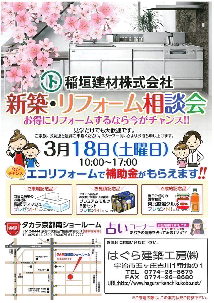 こんにちは(^^)はぐら建築工房のスタッフ・羽倉です。 18日(土)にタカラ京都南ショールムにて、新築・リフォーム相談会・見学会が ありました。ご来場ありがとうございました。